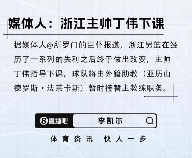 北京时间12月25日中午,一个消息迅速扩散,那就是浙江稠州男篮的主教练,终于下课了。这个消息由直播吧透露,原文是:“据媒体人@所罗门的臣仆报道,浙江男篮在经历了一系列的失利之后终于做出改变,主帅丁伟指导下课,球队将由外籍助教(亚历山德罗斯·法莱卡斯)暂时接替主教练职务。”