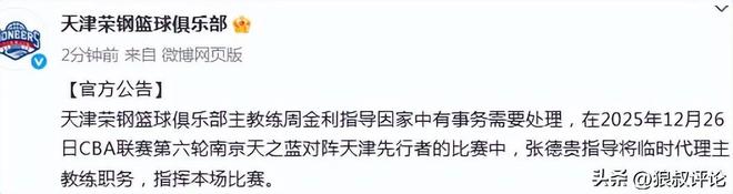 北京时间12月25日,根据男篮官方社媒的公示,天津荣钢篮球俱乐部主教练周金利指导因家中有事务需要处理,在2025年12月26日CBA联赛第六轮南京天之蓝对阵天津先行者的比赛中,张德贵指导将临时代理主教练职务,指挥本场比赛。