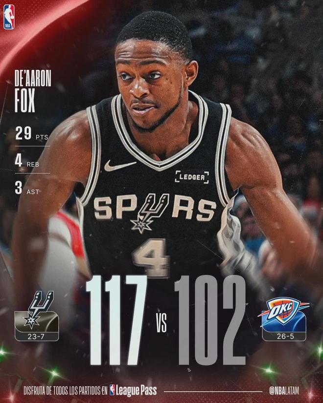 北京时间12月26日,NBA圣诞大战正式打响:马刺客场117-102再胜雷霆。马刺终结雷霆主场14连胜,短短13天之内,马刺三杀联盟第一。这不仅是雷霆本赛季主场首败,也是他们本赛季第一次连败。等到1月14日,两队将再次交手。