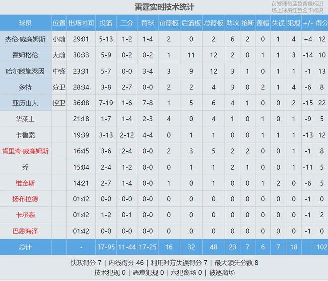 雷霆全队三分球44中11,其中卡鲁索12中2,单场12次三分出手生涯最高!卡鲁索不仅进攻端失准,防守端也被马刺后卫线打爆了。福克斯全场19投12中,三分4中3,罚球2中2,拿到29分4篮板3助攻1抢断1盖帽,正负值+6。