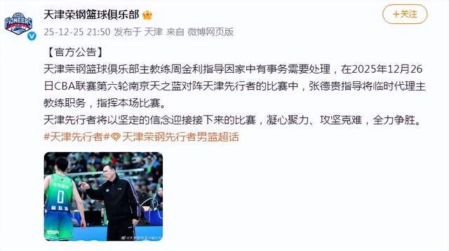 天津男篮是在12月25日深夜发布的公告,根据天津男篮官宣的消息,主帅周金利“因家中有事务需要处理,在2025年12月26日CBA联赛第六轮南京天之蓝对阵天津先行者的比赛中,张德贵指导将临时代理主教练职务,指挥本场比赛。”