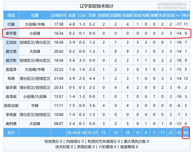 全场比赛,姜宇星打了16分34秒,投篮2中0,交出0分0篮板0助攻0抢断的数据,当然了,外加2次失误,3次犯规。看到姜宇星交出这样的一个数据,相信很多人都是感到目瞪口呆!