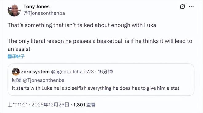 NBA记者托尼·琼斯也抨击了湖人和东契奇,他在推特上表示:“湖人是联盟中球运转最差的球队之一。他们打球自私自利,一切都以自我为中心,这还没算上他们糟糕的防守问题呢。” 一位球迷回复道:“一切都始于卢卡,他太自私了,他做的每件事都必须给他带来数据加成。” 琼斯回复道:“关于卢卡,这一点人们谈论得还不够多。他每次传球的唯一真正原因,就是他认为这带来一次助攻。”