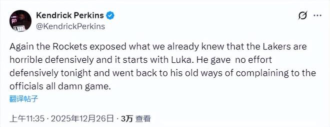 名嘴帕金斯在推特上点名批评了东契奇:“火箭再次证明了我们之前已经知道的事情,那就是湖人防守糟糕,而这始于东契奇。今晚他在防守端没有付出努力,又回到了整场比赛都在向裁判抱怨的老样子。”