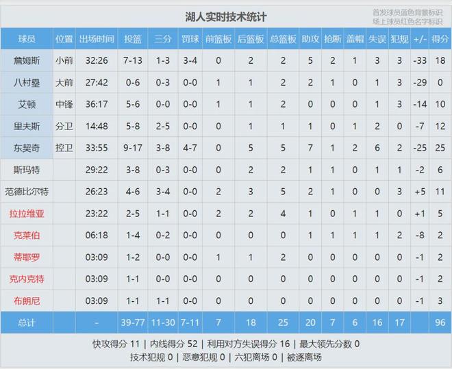 东契奇25分5板7助2帽,正负值-25;詹姆斯18分2板5助2断,正负值-33。火箭篮板球48-25完虐湖人。最后看看数据,说说你的心情: