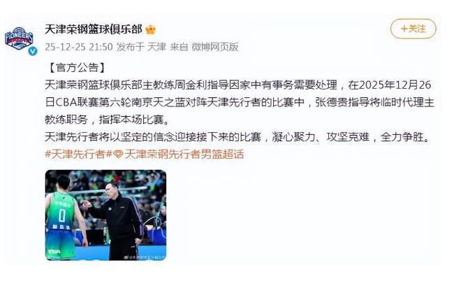 12月25日深夜,天津男篮传来消息,主教练周金利指导因家中有事务需要处理,在2025年12月26日CBA联赛第六轮南京天之蓝对阵天津先行者的比赛中,张德贵指导将临时代理主教练职务,指挥本场比赛。
