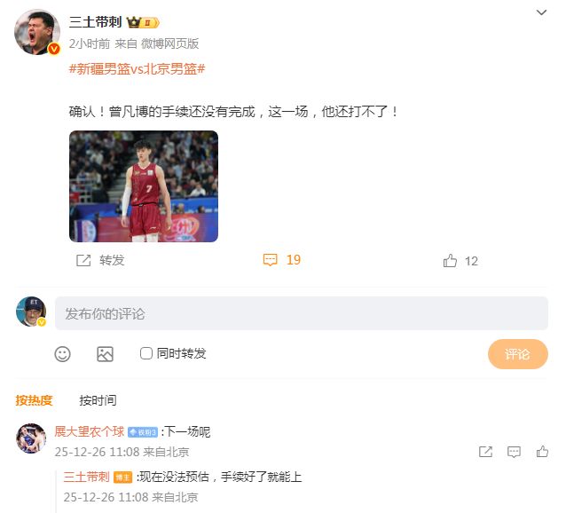 北京时间12月26日,北京男篮将奔赴客场挑战新疆男篮,但根据媒体人三土带刺报道,曾凡博因为手续还没有办完,将缺席今晚的京疆大战。