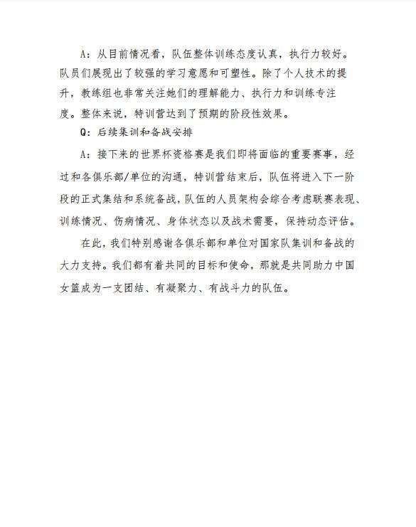 篮协表示,接下来的世界杯资格赛是即将面临的重要赛事,经过和各俱乐部/单位的沟通,特训营结束后,队伍将进入下一阶段的正式集结和系统备战,队伍的人员架构会综合考虑联赛现、训练情况、伤病情况、身体状态以及战术需要,保持动态评估。