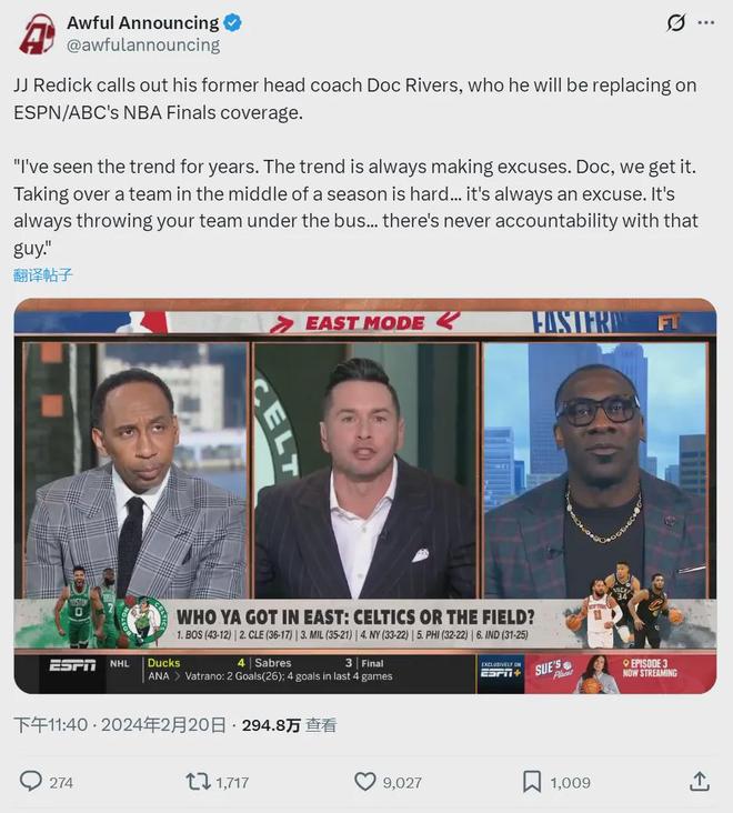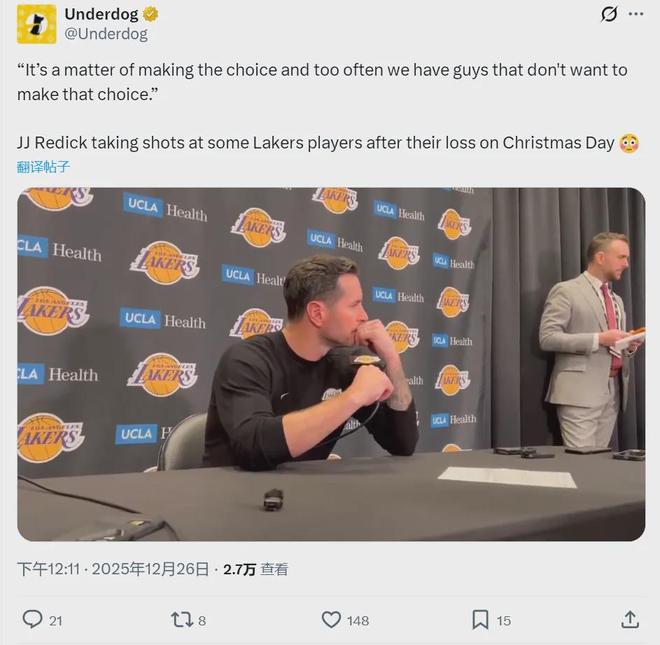 值得一提的是,在雷迪克成为湖人主帅之前,2024年2月,他曾在电视节目中公开批评雄鹿主帅里弗斯甩锅给球员:“把自己的球队和球员推出去当替罪羊,里弗斯这种家伙永远不会承担责任。”过了还不到两年,雷迪克也开始甩锅了。