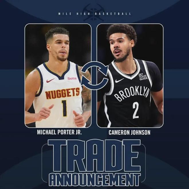 今夏休赛期,掘金将小波特和一个32年无保护首轮签送至篮网,换回卡梅伦-约翰逊;本赛季在篮网的小波特,“因祸得福”打出生涯巅峰一季,至今场均贡献25.7分7.3板3.2助,场均以40.1%命中率扔进3.7记三分球。