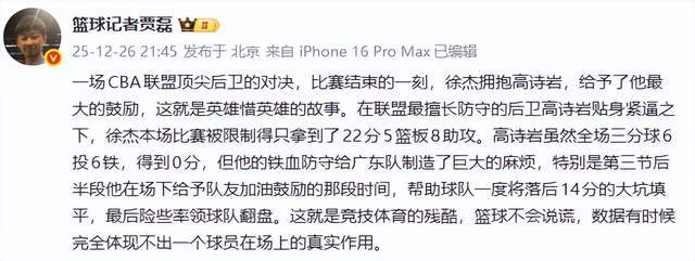 看到如此神勇的高诗岩,篮球记者贾磊老师就忍不住了,公开发声,他在社交平台写道:“一场CBA联盟顶尖后卫的对决,比赛结束的一刻,徐杰拥抱高诗岩,给予了他最大的鼓励,这就是英雄惜英雄的故事。在联盟最擅长防守的后卫高诗岩贴身紧逼之下,徐杰本场比赛被限制得只拿到了22分5篮板8助攻。高诗岩虽然全场三分球6投6铁,得到0分,但他的铁血防守给广东队制造了巨大的麻烦,特别是第三节后半段他在场下给予队友加油鼓励的那段时间,帮助球队一度将落后14分的大坑填平,最后险些率领球队翻盘。这就是竞技体育的残酷,篮球不会说谎,数据有时候完全体现不出一个球员在场上的真实作用。”