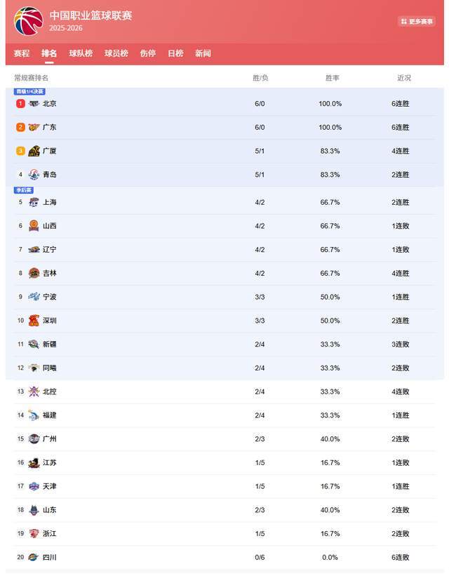 北京广东6连胜领跑,辽篮跌出前6,青岛黑马 山东倒数第3令人汗颜