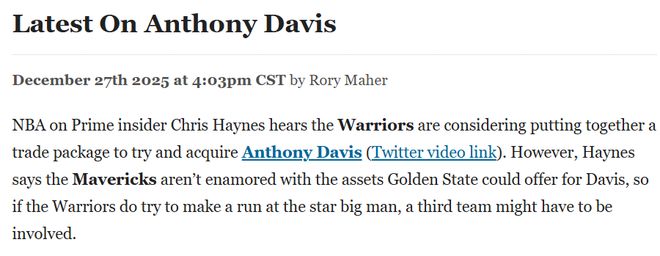 Haynes此前报道,勇士队正考虑组建一套交易方案,尝试引进浓眉。不过他也表示,独行侠队对勇士能够提供的交易筹码并不满意,因此如果勇士真的想要全力追求这位明星内线,这笔交易可能需要第三方球队参与。Haynes补充道,即便最终无法得到浓眉,勇士仍希望在2月交易截止日前引进一名实力出众的防守型中锋。