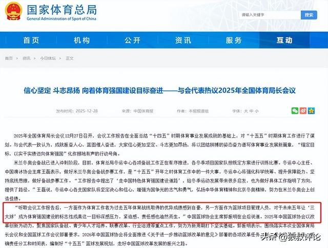 北京时间12月29日,中国篮协主席郭振明在参加2025年全国体育局长会议期间对《中国体育报》表示:“听取会议工作报告后,一方面作为体育工作者为过去五年体育战线取得的优异成绩感到自豪,另一方面作为篮球项目管理人员,对于未来五年让‘三大球’成为体育强国建设的标志性成果这一目标深感压力,紧迫感、责任感也油然而生。”