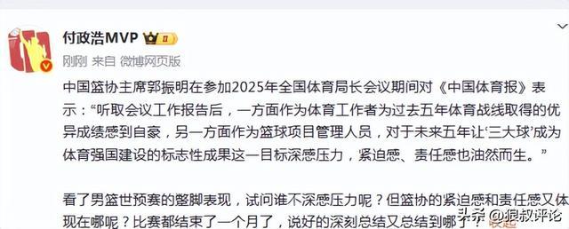 媒体人付政浩发文点评“看了男篮世预赛的蹩脚表现,试问谁不深感压力呢?但篮协的紧迫感和责任感又体现在哪呢?比赛都结束了一个月了,说好的深刻总结又总结到哪了?”
