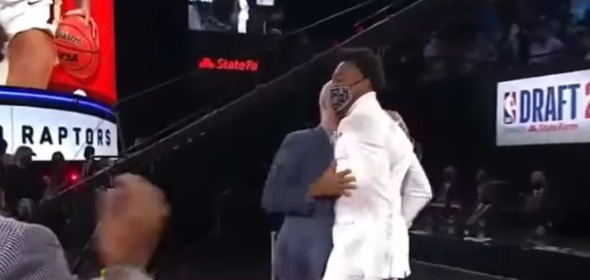2021年选秀大会上,巴恩斯将满头白发的辛普森请到现场,首轮第4顺位,在全场的欢呼声中,他起身紧紧抱住这位如师如父的主教练。