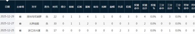 对阵深圳22分钟0分3篮板1助攻1抢断3犯规