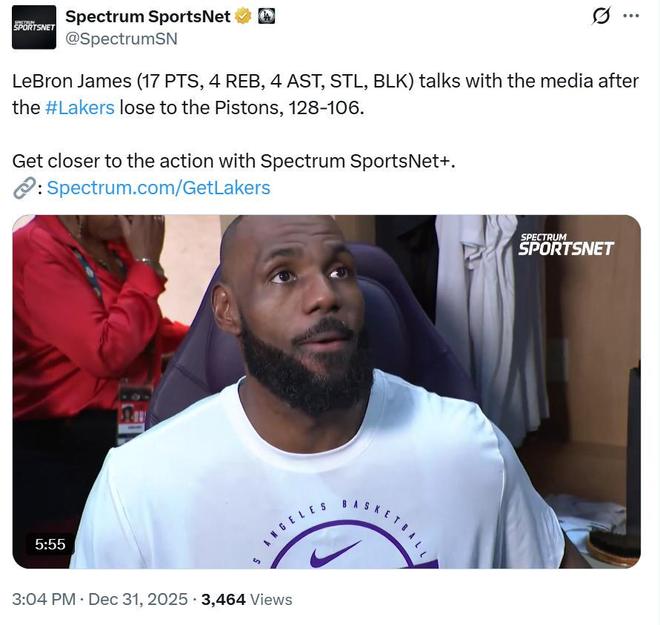 2025年12月31日 湖人末节崩盘负活塞!东契奇30分8失误 詹姆斯生日夜17分