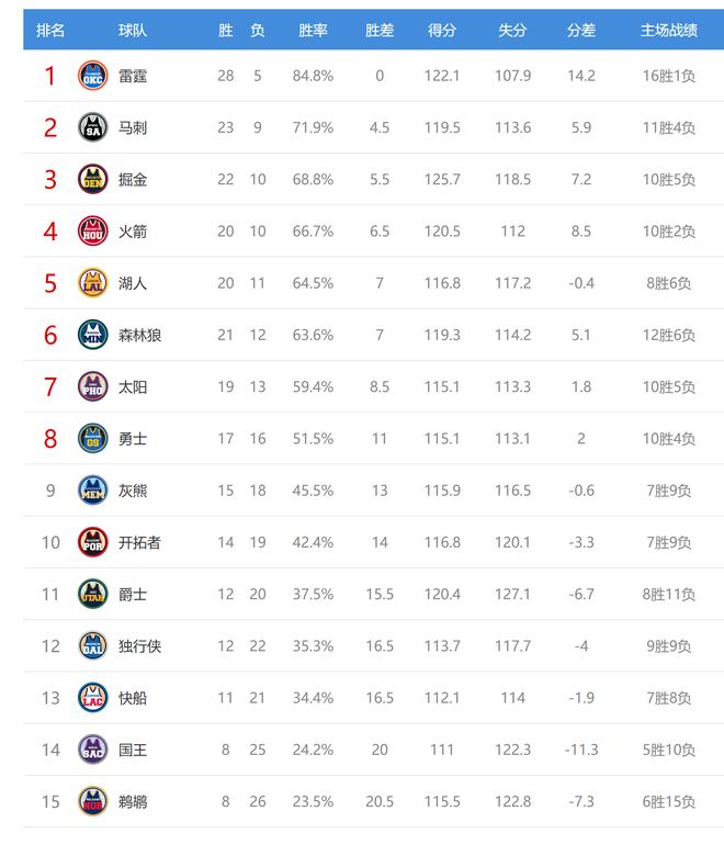 今日比赛后西部排名没有变化,只是胜场差有所改变,西部最新排名如下: