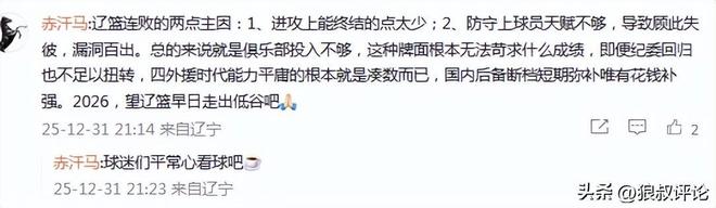 辽篮连败的两点主因:1、进攻上能终结的点太少;2、防守上球员天赋不够,导致顾此失彼,漏洞百出。总的来说就是俱乐部投入不够,这种牌面根本无法苛求什么成绩,即便纪委回归也不足以扭转,四外援时代能力平庸的根本就是凑数而已,国内后备断档短期弥补唯有花钱补强。2026,望辽篮早日走出低谷吧。