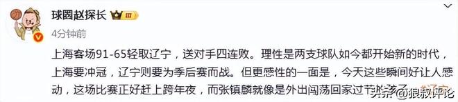 媒体人“赵探长”发文点评:“理性是两支球队如今都开始新的时代,上海要冲冠,辽宁则要为季后赛而战。但更感性的一面是,今天这些瞬间好让人感动,这场比赛正好赶上跨年夜,而张镇麟就像是外出闯荡回家过节的孩子。”