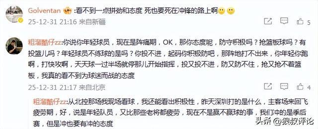你说你年轻球员,现在是阵痛期,OK,那你态度呢,防守积极吗?抢篮板球吗?有投篮儿吗?年轻球员不练球的是吗?你投不进,起码你积极防吧,那阵地打不出来,你年轻你跑啊,打快攻啊,天天球一过半场就停那儿开始指挥,投又投不进,防又防不住,抢又抢不着篮板,我真的看不到为球迷而战的态度。