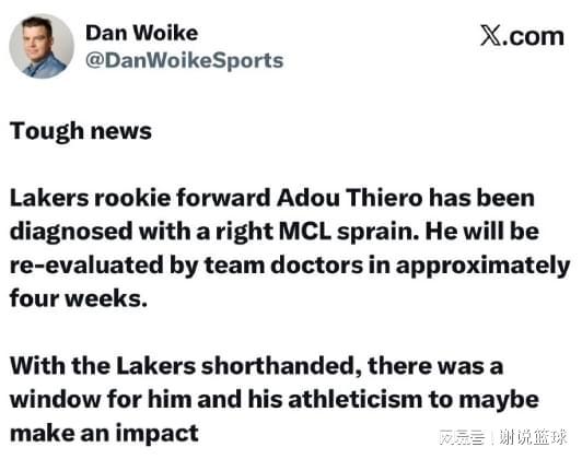 如今湖人又遭遇双重打击,次轮秀侧翼阿杜-蒂耶罗受伤,会至少缺席四周时间。看上去蒂耶罗伤情,并没有那么乐观,因为他被诊断为右膝副韧带扭伤,四周后也并非一定复出,而是接受队医检查,之后如果恢复顺利,才会在简单一系列流程和训练后重新回到球场,指不定那时就全明星周末了。