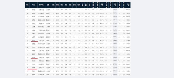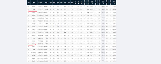 国家队后卫线球员,三分投的最好的暂时是王岚嵚,均出手3.6次,命中率只有34.4%,排在榜单第30。高诗岩排在第35,胡明轩排在第41,前者场均三分命中率30%左右,后者不足30%。程帅澎因伤缺席多轮比赛,场次不够暂未进入榜单。
