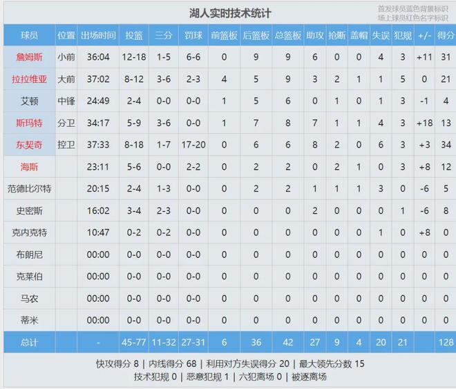 东契奇34分6板8助2断6失误、詹姆斯31分9板6助4失误。拉拉维亚成为湖人第三得分点:12投8中高效砍下21分9板3助2断,今天是拉神。艾顿4中2仅拿4分6板1断,最近的状态太低迷了。莫兰特18中7,得到16分3板11助2断。