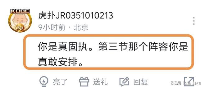 对于许利民的赛后总结,网友们也是纷纷吐槽。“您就这一套词儿说两年了”;“没看到希望,只看到了绝望。”;“许指导,赛后发布会永远的神”;“阿Q情神这块”;“你是真固执。第三节那个阵容你是真敢安排。”;“永远充满希望,永远热泪盈眶,永远豪情满怀,永远坦坦荡荡。”;“又是精神胜利,经典发布会逆转”……