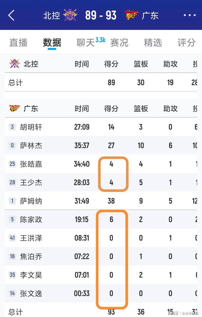 值得一提的是,在这场比赛中,广东队的国内球员,在场上均表现得乏善可陈。全场比赛,小外援萨姆纳砍下38分,大外援萨林杰砍下27分,“双萨组合”合砍65分,但全队9名本土球员,才得了27分。这其中,首发出场的张皓嘉和王少杰各得4分,胡明轩虽然上双得了14分,但效率偏低,场上正负值-10。5个替补中,就陈家政得了6分,剩余4人,王洪泽、焦伯乔、李文昊、张文逸,均为0分。