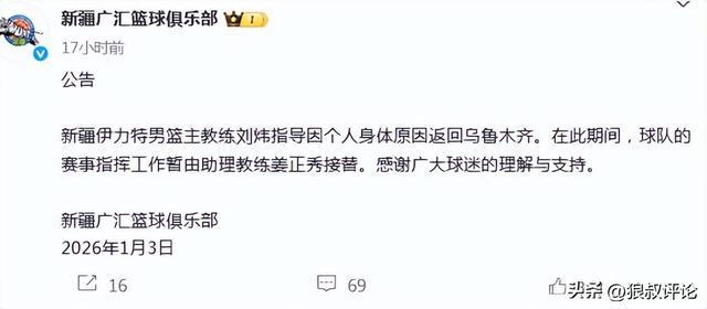新疆男篮主帅刘炜过去6场比赛输球5场,一波3胜6负的开局同样引发教练组变动,根据新疆官方社媒的公示,刘炜将会退出主帅的位置。有消息称目前正在新的主帅筛选工作,前男篮助理教练格兰成为潜在人选。
