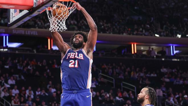 牛,恩比德在76人队大胜尼克斯队的比赛中完成了本赛季的首次扣篮