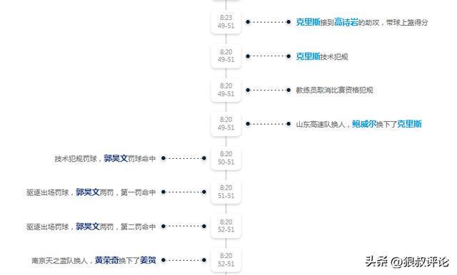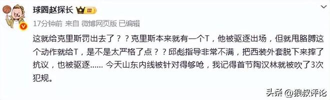 媒体人赵探长发文点评:“这就给克里斯罚出去了??克里斯本来就有一个T,他被驱逐出场,但这个动作就给T,是不是太严格了点??随后邱彪指导也不满,也被驱逐了…… 山东今天被针对得够呛,我记得首节陶汉林就被吹了3次犯规”。