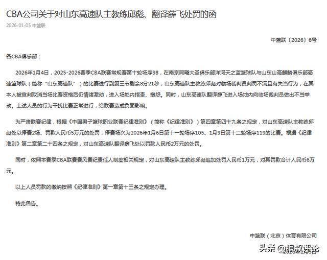 为严肃联赛纪律,根据《中国男子篮球职业联赛纪律准则》(简称《纪律准则》)第四章第四十九条之规定,对山东高速队主教练邱彪处以停赛2场、罚款人民币5万元的处罚,停赛场次为2026年1月6日第十一轮场序105、1月9日第十二轮场序119的比赛。根据《纪律准则》第二章第二十四条之规定,对山东高速队翻译薛飞处以罚款人民币2万元的处罚。