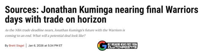 从勇士队的角度来看,自休赛期开始,球队管理层就一直在积极评估联盟其他29支球队对库明加的交易兴趣。这种策略延续到了2025-26赛季上半程,消息人士称,球队内部已经基本达成共识:库明加已经打完了他身披勇士战袍的最后一场比赛。