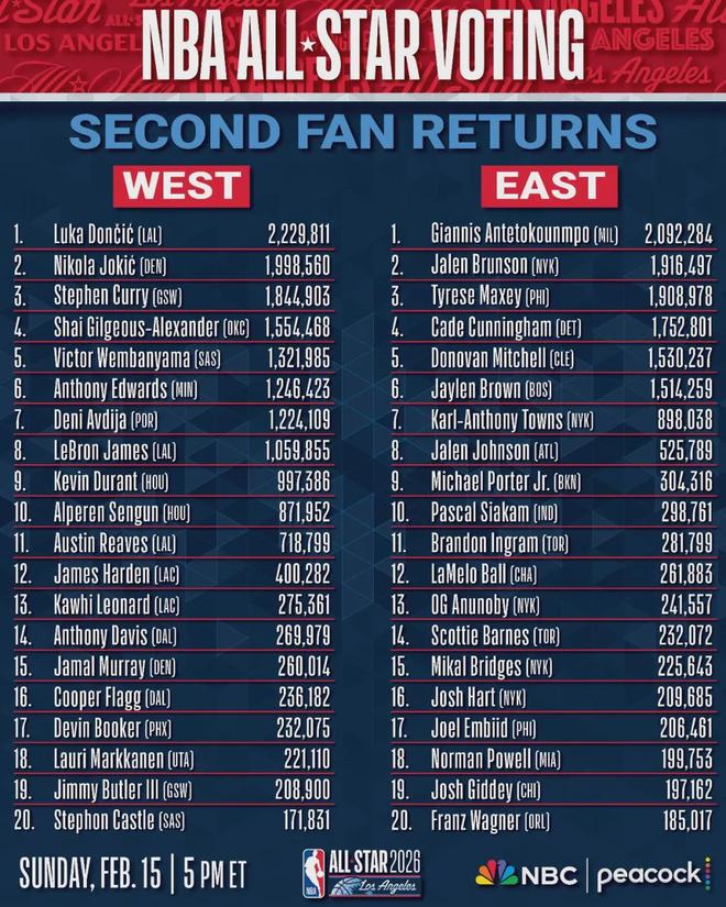 今天NBA官方公布了全明星第二轮的投票结果,东契奇继续领跑全联盟,詹姆斯从首轮西部第九位上升至第八位。西部2-5名分别是约基奇、库里、亚历山大和文班亚马。东部前五分别是字母哥、布伦森、马克西、坎宁安和米切尔。