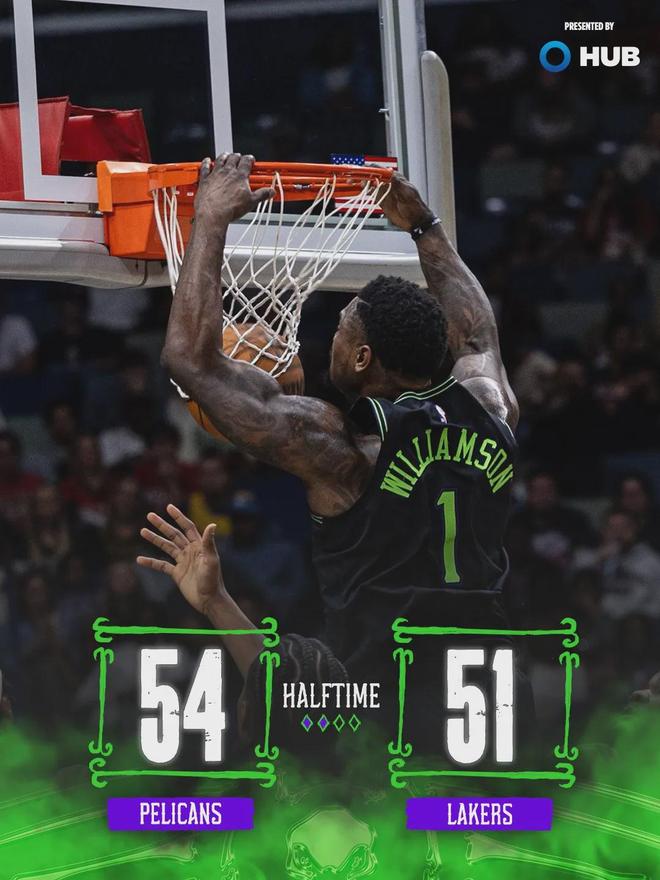 说回比赛,上半场两队打得难解难分,第一节湖人29-25领先4分。第二节鹈鹕29-22,单节净胜7分。半场结束时,鹈鹕54-51完成反超。湖人上半场三分球17中3,三分命中率只有可怜的17.6%。半场替补得分,湖人9-19落后鹈鹕。