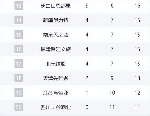 新疆、同曦、福建、北控组成混战集团。新疆队进攻体系渐入佳境,同曦队郭昊文独木难支,福建队单靠外援的爆发难掩整体颓势,北控队张帆的伤病阴影笼罩全队。而天津、江苏、四川三支球队已基本锁定倒数3名,但天津队战胜北控的这场胜利,或许能成为赛季转折点。