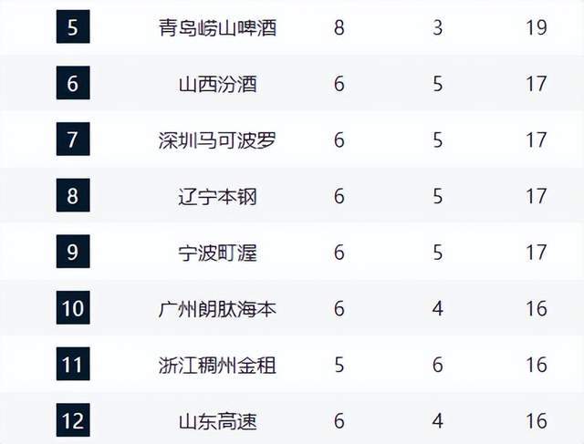 广厦上海北京广东并列前4,辽宁第8,山东进前12,2大黑马下滑