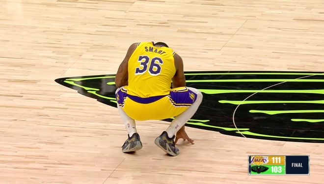 斯玛特因为上一回合的拼抢,痛苦的蹲在球场中央,并没有回到替补席。