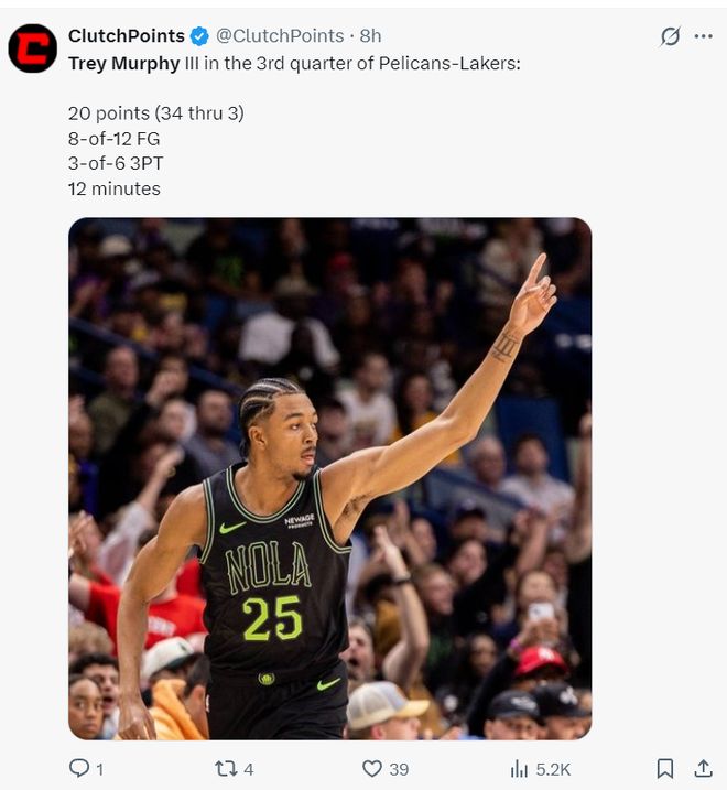 在这个消息出炉后,墨菲在对阵湖人的比赛中就大放异彩,全场比赛39分钟,26中14,三分17中6,罚球9中8,拿到42分5篮板3助攻,命中率53.8%,三分命中率35.3%,他的个人表现比东契奇还要出色。