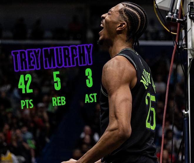 本赛季的墨菲各项数据都有极大提升,场均35.6分钟,拿到21.3分6.1篮板3.5助攻1.5抢断0.2盖帽,命中率49.5%,三分命中率38.2%,鹈鹕官方一直在为他拉全明星选票。