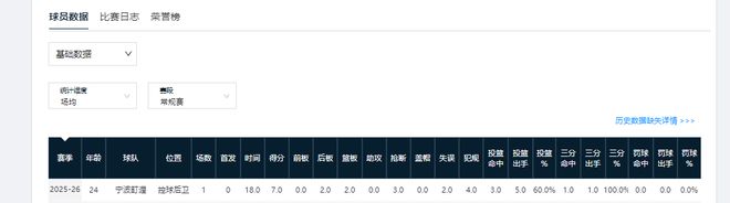 本赛季来到宁波队后,他暂时仅出场过1次,还是在对阵老东家上海男篮时获得的机会。