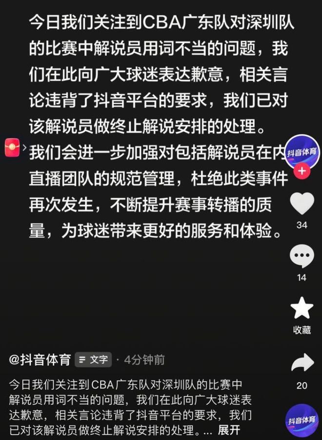 愤怒的广东球迷开始投诉,于是抖音官方赶紧公开道歉,宣布解雇这个解说,并且向广大球迷致歉。