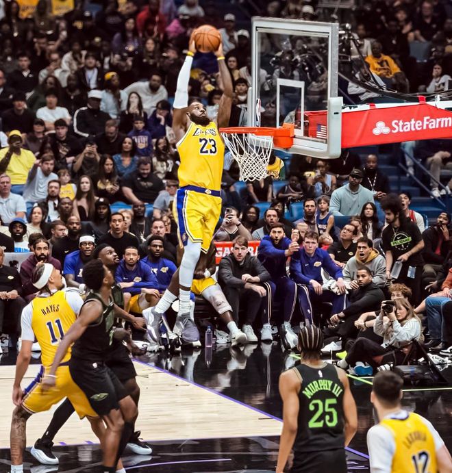 41岁勒布朗在对阵鹈鹕的比赛中完成了一个超框的空接暴扣,老头子的身体状态是真的好,轮休了一场比赛后老头复出。