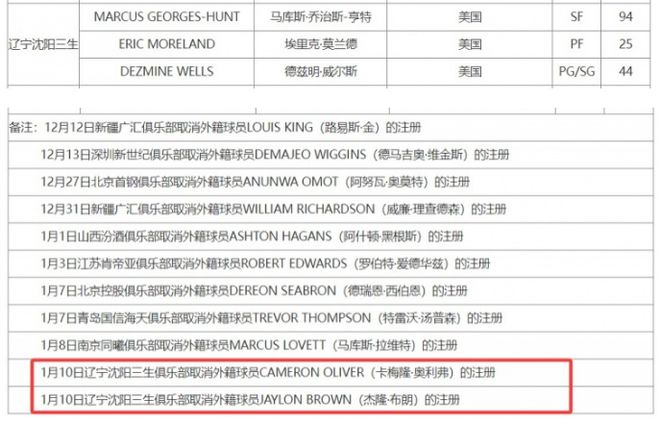 辽宁男篮还感谢奥利弗和布朗,感谢在身披辽宁战袍期间付出的汗水与贡献,CBA官方宣布辽宁男篮已经取消他们的注册。