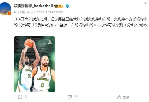根据媒体人导演我躺哪_basketball报道:“CBA开启外援变动期,辽宁男篮已经裁掉外援奥利弗和布朗。”