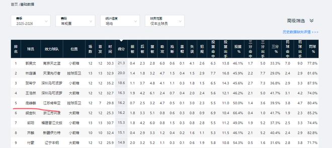 A1类合同在身的王浩然,本赛季不知不觉间已成长为潜在国产第一锋线。12次出场后,他场均可拿到16.3分6.1篮板2.4助攻,三分命中率为41.7%。其中他的得分数,篮板数,三分精准度均在曾凡博、朱俊龙、张镇麟等国家队主力锋线之上。