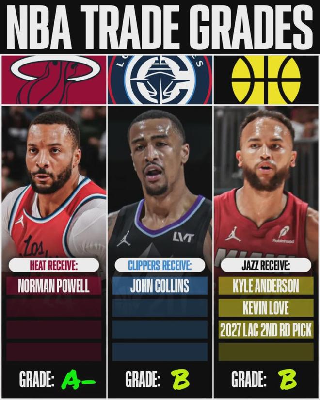 2025年休赛期,快船、热火和爵士达成三方交易:快船得到科林斯、热火得到诺曼-鲍威尔、爵士得到乐福、李凯尔和2027年次轮签(来自快船)。快船相当于用鲍威尔+1个次轮签。2换1得到科林斯。快船终于有真正的4号位了!